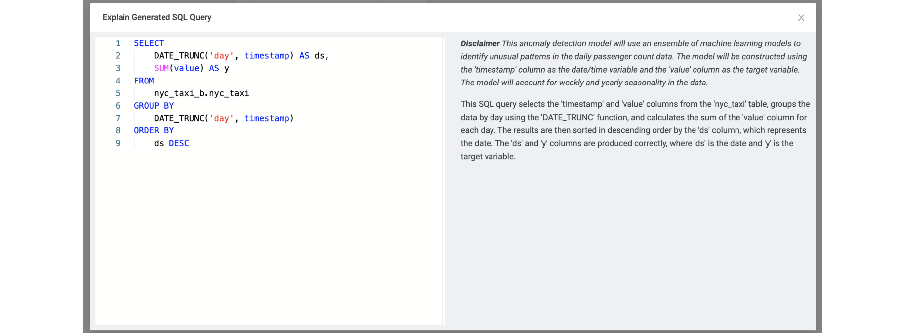 - Query Breakdown: Select the "Query Breakdown" button (visible in the top right of all three example panels) to see the SQL and logic used to generate the forecast.