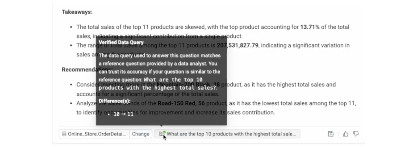 - If another question generates the same SQL, Nexus still shows the badge. Hovering over it displays a tooltip that highlights differences, helping users verify that the data is trustworthy.
